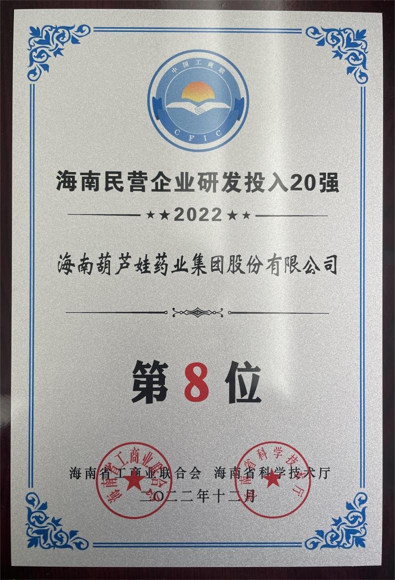 12月23日,2022海南民营企业50强和研发投入20强发布会在海口举行。会上发布了“2022海南民营企业50强”“2022海南民营企业研发投入20强”榜单和分析报告。菠菜导航药业再次荣登两榜,在海南民营企业50强榜单中位列第25位,较去年上升8位,这也是公司连续三年登榜;在海南民营企业研发投入20强中位列第8位,较去年上升7位。
