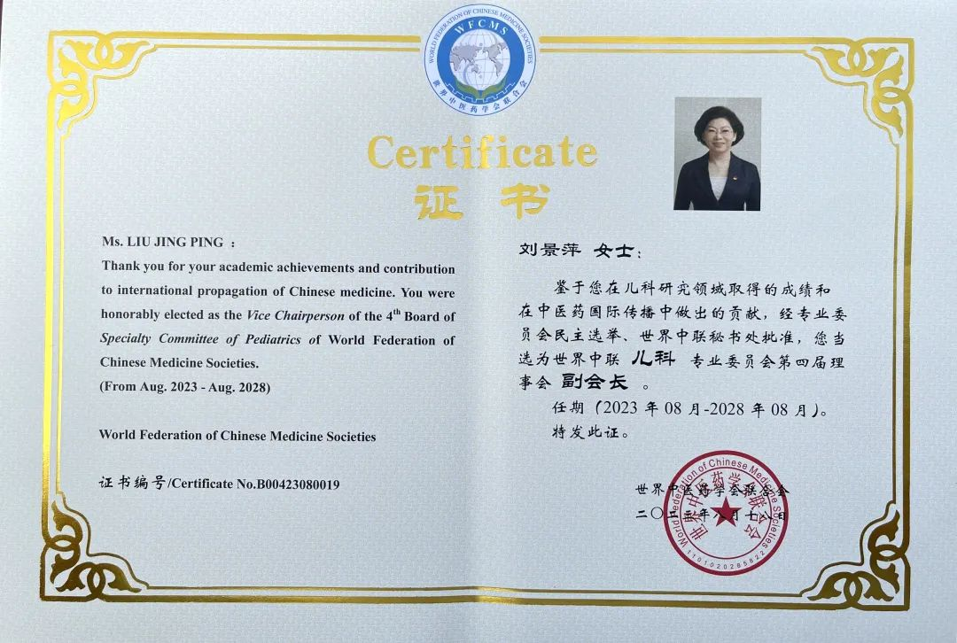 菠菜导航药业集团党委书记、董事长刘景萍当选世界中医药学会联合会儿科专业委员会第四届理事会副会长